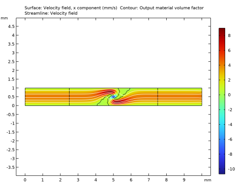 شکل 3 شامل یک نمودار سطحی از مولفه سرعت افقی و یک نمودار ساده از میدان سرعت ناشی از فرآیند بهینه سازی است. علاوه بر این، کانتور γ =  0.5 مرز بین کانال باز و مواد پر کننده را نشان می دهد. نمودارها نحوه چرخش جریان را با سرعت افقی منفی در مرکز کانال نشان می دهند. همچنین توجه داشته باشید که سرعت x  در نقطه طراحیحداقل تقریباً   – 14 میلی‌متر بر ثانیه است.