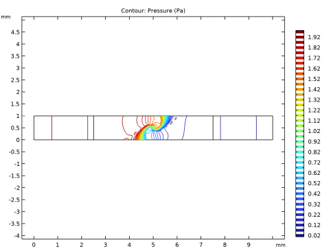 شکل 4 توزیع فشار را نشان می دهد که افت فشار تجویز شده را در طول کانال تأیید می کند. افت فشار به طور طبیعی به منطقه ای با مواد متخلخل متمرکز می شود.