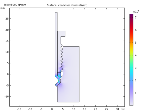 تنش فون میزس برای حداکثر گشتاور اعمال شده، 5 نیوتن متر، در شکل 3 نشان داده شده است . حداکثر مقدار تنش فون میزس زیر تنش تسلیم برای فولاد آلیاژی کلاس 10.9 است.