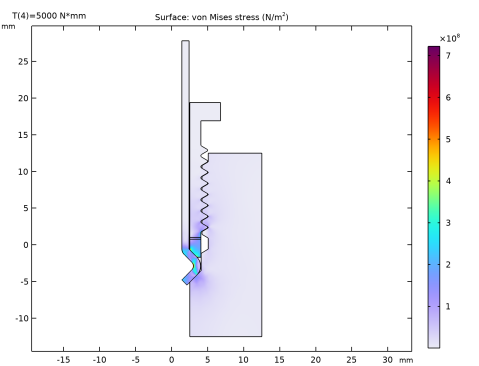 تنش فون میزس برای حداکثر گشتاور اعمال شده، 5 نیوتن متر، در شکل 3 نشان داده شده است . حداکثر مقدار تنش فون میزس زیر تنش تسلیم برای فولاد آلیاژی کلاس 10.9 است.
