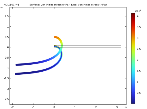 این مشکل به طور جداگانه با استفاده از هر دو رابط مکانیک جامد و پرتو مدل‌سازی شده و نتایج با مقدار معیار مقایسه می‌شوند. با استفاده از رابط مکانیک جامدات، با توجه به اینکه بعد خارج از صفحه کوچک است، مسئله به عنوان یک مسئله “تنش صفحه” مدل‌سازی می‌شود. نسبت پواسون ν روی صفر تنظیم می شود تا شرایط مرزی با مفروضات تئوری پرتو سازگار باشد. بار در انتهای سمت راست تیر به عنوان یک بار مرزی توزیع شده یکنواخت، مطابق با بار کلی مشخص شده مدل‌سازی می‌شود.