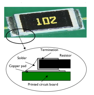 شکل 1: عکس و نمودار یک مقاومت معمولی روی سطح که به PCB لحیم شده است.