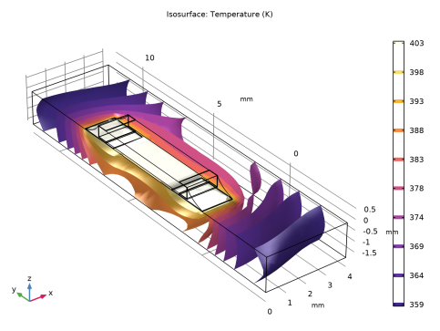 سطوح ایزوسطحی در شکل 3 توزیع دما را در حالت پایدار نشان می دهد. بالاترین دما در مرکز مقاومت رخ می دهد. برد مدار نیز به میزان قابل توجهی گرم می شود.