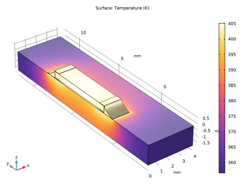 در حین کار، مقاومت 0.2  وات توان را به عنوان گرما تلف می کند. هدایت به PCB و همرفت به هوای اطراف خنک کننده را فراهم می کند. در این مدل انتقال حرارت از طریق رسانایی در زیر دامنه ها انجام می شود. این مدل خنک‌سازی سطح را ساده می‌کند و آن را با استفاده از ضریب انتقال حرارت، h ، توصیف می‌کند که در این مورد روی 10  W/(m2 · K) تنظیم می‌شود. دمای هوای اطراف، inf ، 300 کلوین است.  معادله انتقال حرارت حاصل و شرایط مرزی (که در مدل با استفاده از رابط انتقال حرارت موجود است)