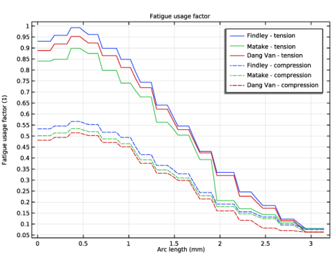 تفاوت زیادی در ضریب استفاده از خستگی بین سمت بالا (کشش) و پایین (فشرده) میله وجود دارد ( شکل 9 را ببینید.، حتی اگر تنش معادل در هر دو مکان یکسان باشد. این نشان میدهد که چگونه معیار تفاوت بین حالتهای تنش کششی غالب در نقطه بحرانی و حالتهای تنش فشاری در طرف دیگر را نشان میدهد. علاوه بر این، تفاوت آشکاری بین مدل ها وجود دارد. در تنش، مدل Dang Van ضریب استفاده از خستگی بالاتری را نسبت به مدل Matake پیشبینی میکند، در حالی که در فشردهسازی، این ضریب مصرف برعکس است. بنابراین، مقادیر محاسبه شده نباید به عنوان پیشبینی دقیق خستگی، بلکه به عنوان یک نتیجه احتمالی در نظر گرفته شوند. هر مدل حوزه استفاده ترجیحی دارد و کاربرد در حوزه کمی متفاوت میتواند منجر به پیشبینی خستگی کمتر شود.