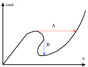 شکل 1 تغییر بار در برابر جابجایی را برای چنین مورد دشواری نشان می دهد. این مشکل محاسباتی احتمالی را با استفاده از یک کنترل بار (مسیر A) یا یک کنترل جابجایی (مسیر B) نشان می دهد.