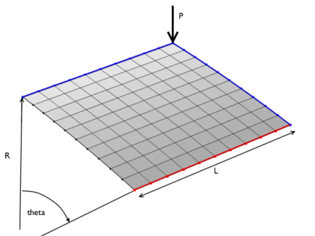 | • | شعاع سیلندر R  =  2.54 متر است و تمام لبه ها 2 L  =  0.508 متر  طول دارند  . بنابراین، دهانه زاویه ای پانل 0.2  رادیان است. ضخامت پانل th  =  6.35  میلی متر است. |