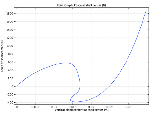 در شکل 3 می توانید بار اعمال شده را به عنوان تابعی از جابجایی مرکز پانل مشاهده کنید. شکل به وضوح یک راه حل غیر منحصر به فرد را برای یک بار اعمال شده معین (بین – 400  نیوتن تا 600  نیوتن) یا یک جابجایی معین (بین 14.4  میلی متر تا 17  میلی متر) نشان می دهد.