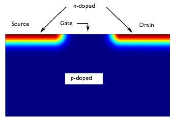 این مدل یک ماسفت دوبعدی را نشان میدهد که در آن کنتاکتهای درین و منبع دوپ شده به ترتیب در بالا سمت راست و سمت چپ هندسه قرار دارند. شکل 1 را ببینید . گیت در بالای بخش سیلیکونی دوپ شده p قرار گرفته است که در مرکز دستگاه قرار دارد.