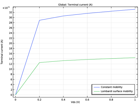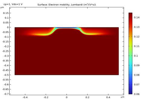 این مثال نحوه استفاده از مدل پراکندگی سطحی لومباردی را برای تحرک الکترون در یک ماسفت ساده نشان می دهد. غیرخطی اضافی معرفی شده توسط وابستگی میدان تحرک به آسانی توسط توالی حل کننده خود تولید شده با تشخیص چنین مدل های تحرک توسط رابط فیزیک نیمه هادی غلبه می کند. مشخصات چگالی جریان و جریان کل وارد شده به ترمینال با حالت تحرک ثابت مقایسه می شود.