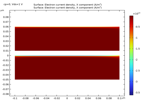 مدل ولتاژ تخلیه را از 0  ولت تا 1  ولت با ولتاژ گیت اعمال شده 1  ولت جارو می کند. ما انتظار داریم میدان الکتریکی عمودی قابل توجهی (به جریان) در زیر تماس گیت وجود داشته باشد. به منظور اطمینان از همگرایی مدل غیرخطی، رابط فیزیک نیمه هادی یک حلگر جدا شده ایجاد می کند تا ابتدا متغیرهای وابسته اصلی را با مولفه های عمود بر الکترون و حفره میدان (E⊥,n و E⊥, p ) ثابت و سپس حل کند . متغیرهای میدان الکتریکی را جداگانه به روز کنید.