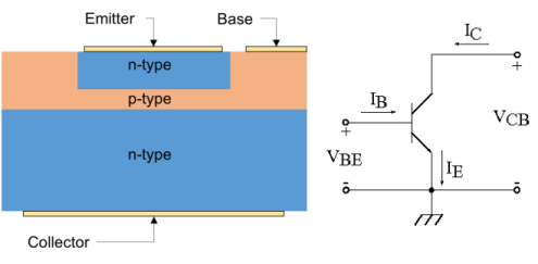 شکل 1: سمت چپ: مقطع ساده شده از طریق یک ترانزیستور دوقطبی که ساختار دستگاه را نشان می دهد. سمت راست: نمودار مداری که پیکربندی امیتر رایج را نشان می دهد.
