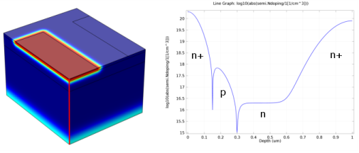 هندسه مدل در شکل 2 نشان داده شده است . با توجه به تقارن دستگاه تنها یک چهارم کل سازه به صراحت مدل سازی شده است. مشخصات دوپینگ مدل شده در شکل 3 نشان داده شده است . همانطور که نمونه پروفیل مورد استفاده در ترانزیستورهای دوقطبی سیلیکونی است، از چهار ناحیه (n+، p، n، و n+) تشکیل شده است که در دستورالعمل مدلسازی به تفصیل توضیح داده شده است .