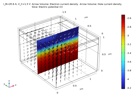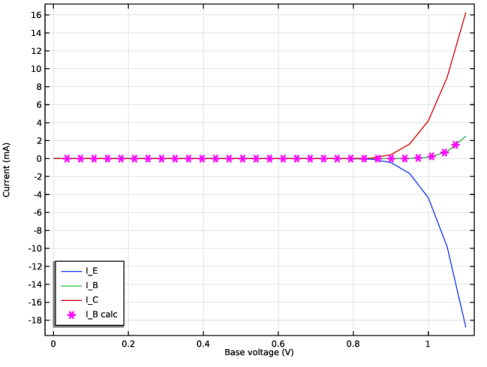 شکل 4 جریان در هر ترمینال را به عنوان تابعی از ولتاژ پایه-امیتر ( V BE ) برای ولتاژ ثابت کلکتور-امیتر ( V CE = 0.5  V) نشان می دهد. توجه داشته باشید که شکل جریان های ترمینال را با استفاده از قرارداد COMSOL Multiphysics نشان می دهد: جریانی که از کنتاکت به نیمه هادی می گذرد مثبت است و جریانی که از نیمه هادی به داخل کنتاکت می ریزد منفی است. شکل همچنین نشان می دهد که جریان حفظ شده است. این را می توان به این صورت مشاهده کرد که مجموع جریان های پایه و کلکتور دارای مقدار برابر و علامت مخالف با جریان امیتر هستند، یعنی: جریان پایه را می توان با استفاده از جریان های دیگر محاسبه کرد.