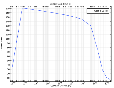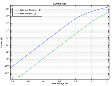شکل 5 نمودار Gummel را برای ترانزیستور دوقطبی مدل شده نشان می دهد. نمودار Gummel بزرگی جریان کلکتور و پایه را نشان می دهد که در مقیاس لگاریتمی، تابعی از ولتاژ پایه است.