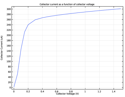 جفت مطالعات بعدی جریان کلکتور را به عنوان تابعی از ولتاژ کلکتور هنگامی که جریان 2 uA به پایه اعمال می شود محاسبه می کند. هنگامی که یک جریان به یک مخاطب اعمال می شود، گفته می شود که مشکل جریان محور است. برای محاسبه مشکلات ناشی از جریان در COMSOL، اغلب ایده خوبی است که ابتدا یک مطالعه ولتاژ محور مناسب انجام شود، که در آن فقط ولتاژها به کنتاکت ها اعمال شود تا مقادیر اولیه مناسب برای متغیرهای وابسته تولید شود. در این مورد، این با استفاده از مطالعه ای به دست می آید که ولتاژ پایه را با ولتاژ کلکتور و امیتر هر دو روی 0 ولت تنظیم می کند.
