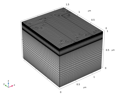 هندسه مدل را ایجاد کنید، دستگاه از دو بلوک و یک صفحه کار تشکیل شده است. بلوک بزرگتر حجم دستگاه را مشخص می کند و بلوک کوچکتر هنگام تولید مش ساختار یافته استفاده می شود. برنامه کاری برای تعریف هندسه کنتاکت های الکتریکی در سطح بالایی استفاده می شود. توجه داشته باشید که از آنجایی که دستگاه دارای صفحات تقارن در صفحات xz – و yz – است که از مبدأ عبور می کنند، تنها لازم است یک چهارم دستگاه را مدل کنید.