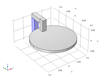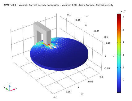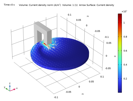 مدل COMSOL Multiphysics برای یک دیسک مسی با ضخامت 1  سانتی متر با شعاع 10  سانتی متر و سرعت زاویه ای اولیه 1000 دور در دقیقه تنظیم شده است  . آهنربا از یک آهنربای دائمی 1  T و سخت ( μ r  = 1 ) تشکیل شده است که به یک یوغ آهنی با شکاف هوایی 1.5  سانتی متری متصل است که در آن دیسک مسی می چرخد. شکل های زیر به ترتیب چگالی جریان گردابی القایی و تکامل زمانی سرعت زاویه ای، گشتاور ترمز و توان تلف شده را نشان می دهند.
