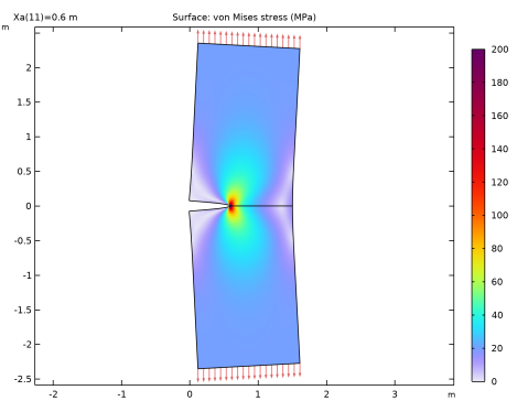 شکل 2: تنش فون میزس و شکل تغییر شکل صفحه زمانی که طول ترک 0.6 متر است. برای نشان دادن تغییر شکل تحت بار اعمال شده، جابجایی اغراق آمیز است.