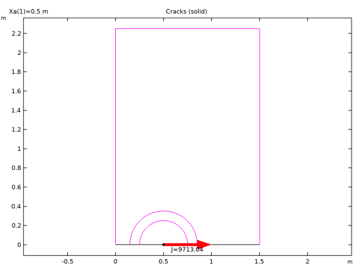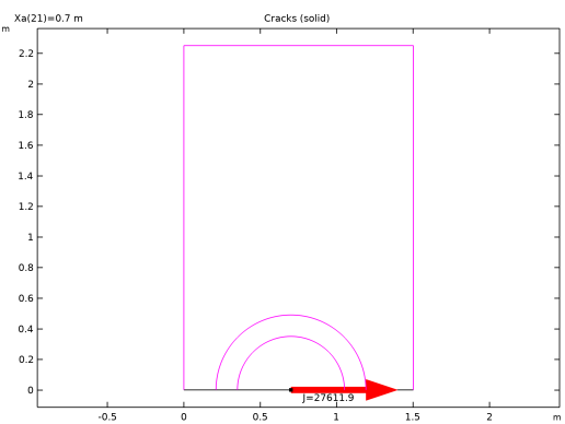 هنگام استفاده از محاسبات انتگرال J داخلی، باید مطمئن شوید که هیچ یک از خطوط مورد استفاده برای ادغام خارج از حوزه محاسباتی عبور نمی کند، یا شکاف دیگری را در بر نمی گیرد. در کرکهای طرح پیشفرض ، تمام مسیرهای ادغام تجسم میشوند. در شکل 3 و شکل 4 خطوط به ترتیب برای کوتاه ترین و طولانی ترین ترک ها نشان داده شده است.