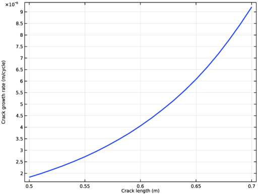 در نهایت می توان سرعت رشد ترک را بررسی کرد. در شکل 6 ، سرعت رشد ترک به عنوان تابعی از طول ترک نشان داده شده است. وابستگی کاملاً قوی است: افزایش طول ترک از 0.5  متر به 0.7  متر (40٪) نرخ رشد ترک را ضریب 5 افزایش می دهد . با توجه به ثابت های استفاده شده در قانون پاریس، نرخ رشد ترک متناسب با ضریب شدت تنش است که به توان 3.1 افزایش یافته است . همانطور که از نتایج قبلی مشاهده می شود، ضریب شدت تنش با طول ترک به شدت افزایش می یابد و این ترکیب منجر به افزایش سرعت رشد ترک می شود.