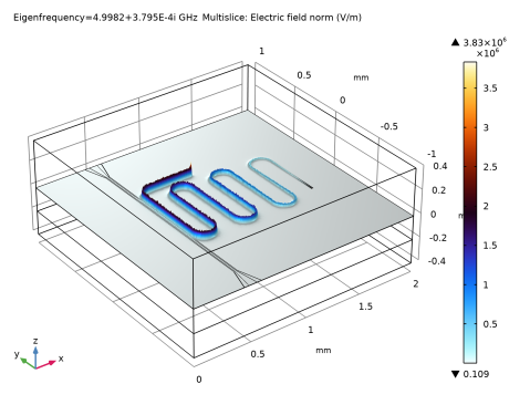 شکل 3 پارامترهای S سیستم را نشان می دهد. رفتار تشدید کننده موج چهارم را می توان در بازتاب رزونانس قوی در S 11 دسی بل مشاهده کرد، در حالی که در آنجا خط تغذیه بسیار انتقال دهنده به دور از فرکانس رزونانس است. این بیشتر در شکل 4 نشان داده شده است ، که شکل گیری موج ایستاده را در تشدید کننده CPW نشان می دهد. یک افزایش میدان الکتریکی بزرگ در انتهای باز و میدان صفر در انتهای کوتاه وجود دارد که مطابق با رفتار پیش‌بینی‌شده شرایط مرزی است.