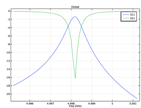 شکل 3: نمودار پارامترهای S یک رفتار رزونانس بسیار باریک را نشان می دهد.