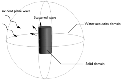 این مدل رفتار یک استوانه جامد را در یک حوزه آب با یک موج صوتی فرود در آب شبیه‌سازی می‌کند. دیواره های جسم تحت تاثیر فشار صوتی قرار می گیرند. مدل پاسخ فرکانسی را از جامد محاسبه می کند و سپس این اطلاعات را به حوزه آکوستیک باز می گرداند تا بتواند الگوی موج حاصل را تجزیه و تحلیل کند. به این ترتیب، این مدل نمونه خوبی از یک مسئله برهمکنش صوتی-جامد پراکنده است.