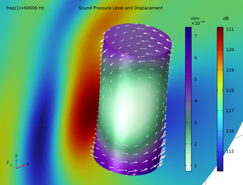 شکل 1 سیلندر آلومینیومی غوطه ور در آب را نشان می دهد. موج فرودی 60  کیلوهرتز، در ناحیه اولتراسوند است. ارتفاع استوانه 2  سانتی متر و قطر آن 1  سانتی متر است. حوزه آکوستیک آب به صورت یک کره با قطر نسبتاً بزرگ کوتاه شده است. چیزی که سیستم را به حرکت در می آورد یک موج صفحه فرود از محیط اطراف به سمت مرز کروی است. فشار صوتی هارمونیک در آب روی سطح سیلندر به عنوان یک بار مرزی در جامد سه بعدی عمل می کند تا تداوم فشار را تضمین کند. مدل جابجایی هارمونیک و تنش ها را در سیلندر جامد محاسبه می کند و سپس از شتاب عادی سطح جامد در مرز حوزه آکوستیک برای اطمینان از تداوم شتاب استفاده می کند.