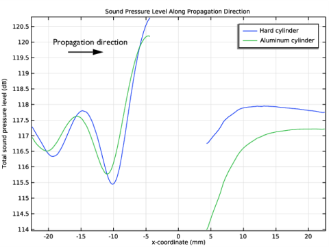شکل 3 مقایسه ای بین نمونه دیوار سخت و مدل جامد کامل آلومینیومی را نشان می دهد. در نزدیکی دیواره سیلندر، نمودار نشان می‌دهد که سطح فشار صدا (SPL) در سمت بالادست برای محفظه دیوار سخت نسبت به مدل آلومینیومی بالاتر است. این مورد در سمت پایین دست نیز صادق است، جایی که SPL برای مدل دیوار سخت بالاتر از مدل آلومینیومی است. این نشان می دهد که دیوار سخت بیشتر از بدنه آلومینیومی منعکس می شود. نتیجه این است که خواص مکانیکی جسم فلزی بر روی امضای صوتی تأثیر می گذارد.