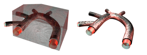 شکل 2: نمای آئورت و انشعاب آن (رگ های منشعب) با خون موجود، هم با (چپ) و هم بدون (راست) عضله قلب نشان داده شده است.