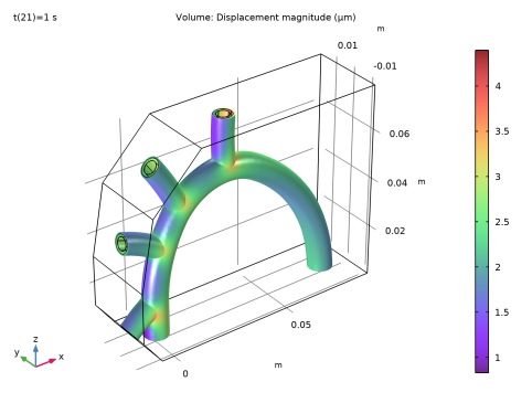 شکل 5 جابجایی کل در بار اوج (پس از 1 ثانیه) را نشان می دهد. جابهجاییها به ترتیب 4 میکرومتر هستند ، که نشان میدهد کوپلینگ چندفیزیکی یکطرفه یک تقریب معقول است.