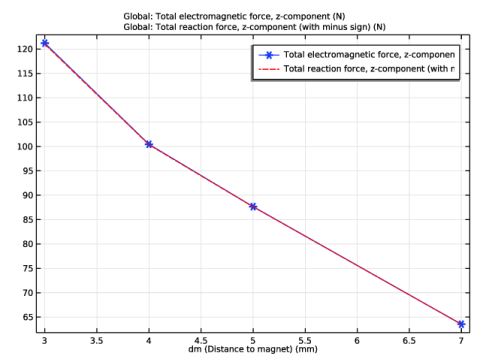 بدنه مغناطیسی و نیروهای سطحی وارد بر صفحه به طور خودکار توسط ویژگی کوپلینگ در انتخاب آن اعمال می شود. بعداً در مدلسازی، یک گره محاسبه نیرو را نیز در رابط فیزیک میدانهای مغناطیسی، بدون جریان اضافه میکنید. گره فقط در پس پردازش برای محاسبه کل نیروی وارد بر صفحه استفاده می شود.