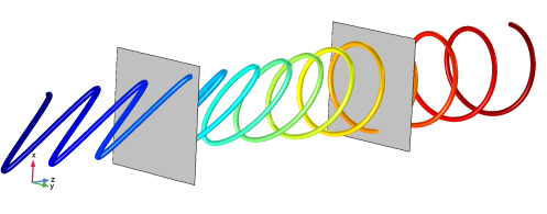 شکل 1: تکامل دامنه میدان الکتریکی آنی در یک صفحه موج. یک محیط دوشکست بین دو سطح وجود دارد که محورهای معمولی و غیرعادی موازی با محورهای x و y هستند. همانطور که پرتو قطبی شده خطی در جهت z منتشر می شود، به تدریج به صورت دایره ای قطبی می شود.