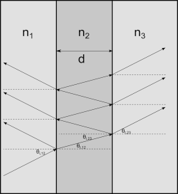 رابط بین دو رسانه را می توان با یک یا چند فیلم دی الکتریک نازک پوشاند تا ضرایب بازتاب و انتقال را تغییر دهد. معمولاً منظور از “نازک” این است که ضخامت لایه با طول موج تابش قابل مقایسه است، اما برای تجزیه و تحلیل زیر تنها شرط این است که ضخامت لایه بسیار کوچکتر از طول پیوستگی تابش باشد. هنگامی که پرتو فرودی وارد یک فیلم دی الکتریک نازک می شود، در دو سطح مجاور به عقب و جلو بازتاب می شود و در هر ناحیه پرتوهای شکسته زیادی تولید می کند.