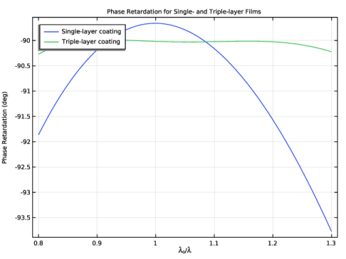نمودار تغییر فاز را به عنوان تابعی از طول موج فضای آزاد تابش نشان می دهد. هنگامی که از یک فیلم تک لایه استفاده می شود، تغییر فاز حدود 4 درجه در محدوده فرکانس شبیه سازی شده تغییر می کند. اکنون آنالیز را با استفاده از یک فیلم چند لایه تکرار کنید.