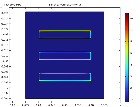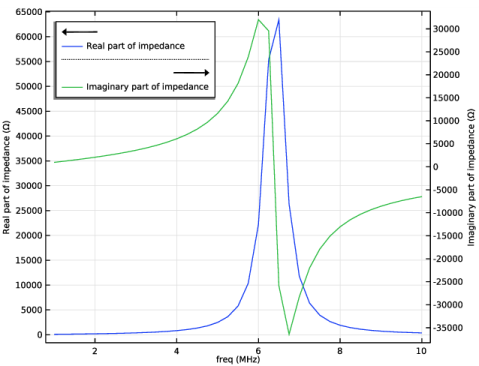 بارزترین علامت تشدید در شکل 9 نشان داده شده است ، جایی که بخش های واقعی و خیالی امپدانس سیم پیچ نشان داده شده است. مقاومت (منحنی آبی) در ده ها kΩ همراه با راکتانس تقسیم بر فرکانس زاویه ای (منحنی سبز) نشان داده شده است . منحنی سبز در فرکانس های پایین از اندوکتانس استاتیک شروع می شود، رشد می کند و سپس منفی می شود. هنگامی که منحنی سبز منفی می شود، به این معنی است که سیم پیچ مانند یک خازن رفتار می کند. بخش واقعی امپدانس تلفات را محاسبه میکند و در فرکانسهایی که سهم خازنی و القایی به تعادل امپدانس کلی سیستم کمک میکند، به اوج میرسد. موقعیت و مقدار پیک مشخص شده توسط مدل متقارن محوری دوبعدی نیز با مدلهای سه بعدی اصلی در مقدمه ماژول AC/DC مطابقت دارد.دستی نسبتاً خوب