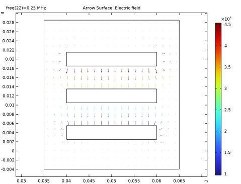 شکل 8: میدان الکتریکی بین پیچ ها در فرکانس رزونانس.