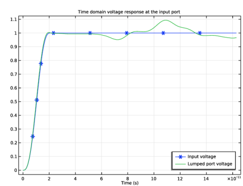 نمودار ولتاژ ورودی و اندازهگیری شده را در پورت لامپ 1 نشان میدهد. نوسان در ولتاژ اندازهگیریشده در پورت تودهای 1 نشان میدهد که موج منعکسشده از ناپیوستگیها باعث اعوجاج سیگنال میشود. ناپیوستگی ها در خط ریز نوار خمیده قرار دارند و از طریق سوراخ فلزی می شوند.
