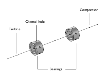 این مدل شامل یک روتور توربوشارژر است که توسط دو یاتاقان حلقوی شناور پشتیبانی می‌شود، یکی در نزدیکی کمپرسور و دیگری در نزدیکی توربین، که باعث می‌شود کمپرسور و توربین روی شفت آویزان شوند. شماتیک روتور در شکل 1 نشان داده شده است .