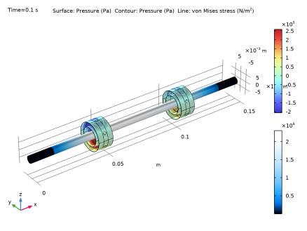 فشار در یاتاقان ها و تنش در روتور در شکل 2 نشان داده شده است . حداکثر تنش در ناحیه مرکزی روتور رخ می دهد. فشار در پایین یاتاقان حداکثر است زیرا روتور به دلیل نیروی گرانشی از مرکز یاتاقان به سمت پایین حرکت می کند. فاصله بین ژورنال و حلقه و همچنین حلقه و بوش به دلیل این حرکت کاهش می یابد.