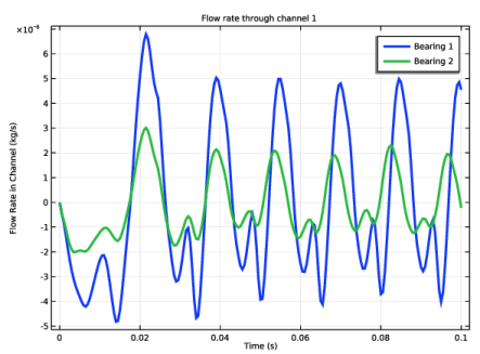 نرخ جریان جرمی در کانال اول هر دو یاتاقان در شکل 7 نشان داده شده است . در طول پاسخ گذرا، ما یک رفتار غیر دوره ای در نرخ جریان می بینیم، اما با رسیدن به حالت پایدار، تغییرات نرخ جریان دوره ای است. همچنین نرخ جریان در طول یک چرخه از مقادیر مثبت به منفی تغییر می کند. این نشانه‌ای از جریانی است که از هر دو طرف از فیلم داخلی به فیلم بیرونی و بالعکس اتفاق می‌افتد.
