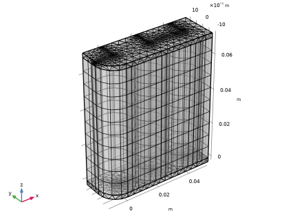 مشخصات دما با استفاده از یک رابط انتقال حرارت مدلسازی میشود، جایی که منابع گرمایی ناشی از مدلهای باتری، و گرمایش ژول در هادیهای الکتریکی، با استفاده از یک گره چندفیزیکی گرمایش الکتروشیمیایی گنجانده شدهاند. همرفت در حوزه پر از هوا که باتری ها را در بر می گیرد، با فرض شرایط سکون، نادیده گرفته می شود. مرزهای بیرونی بسته با استفاده از شرایط خنک کننده همرفتی خنک می شوند. شرایط تقارن (بدون شار) برای مرزهای تقارن مسطح داخلی رو به بقیه بسته استفاده می شود.