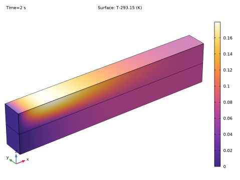 شکل 2 توزیع دما را در انتهای ارتعاشات اجباری 2 ثانیه ای شبیه سازی شده نشان می دهد. همانطور که در شکل نشان داده شده است، حداکثر افزایش دما در پرتو حدود 0.18  کلوین