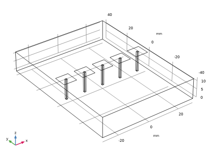 این مثال با ساختار EBG متشکل از قارچهای فلزی شروع میشود که قبلاً طوری مهندسی شده است که دارای یک شکاف باند در مرکز 1.85 گیگاهرتز باشد. همانطور که در شکل 1 نشان داده شده است، یک ردیف از این ساختارهای قارچی بین دو آنتن قرار می گیرند . یک استفاده معمولی از چنین ساختار EBG، ایجاد جداسازی بین عناصر یک آنتن آرایه ای است. این مثال تنها از دو عنصر آنتن برای نشان دادن مفهوم استفاده می کند.