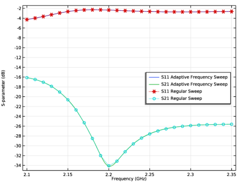 همان مدل را با وضوح فرکانس بسیار ظریفتر با استفاده از جابجایی فرکانس تطبیقی بر اساس ارزیابی شکل موج مجانبی (AWE) تحلیل کنید. هنگامی که یک دستگاه یک پاسخ فرکانسی به آرامی متغیر ارائه می دهد، روش AWE زمان حل سریع تری را هنگام اجرای شبیه سازی در بسیاری از نقاط فرکانس ارائه می دهد. مثال زیر با جابجایی فرکانس تطبیقی میتواند پنج برابر سریعتر از جابجاییهای دامنه فرکانس معمولی با وضوح فرکانس یکسان محاسبه شود.