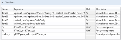 در اینجا εr1 و εr2 به ترتیب گذردهی نسبی روغن و آب را نشان می دهند . این مدل به جای استفاده از یک متغیر تعریف شده توسط کاربر، از ماده چند فازی برای تعریف خواص مواد موثر استفاده می کند. به این ترتیب، متغیر es.epsilonr_iso در واسط الکترواستاتیک در حال حاضر ویژگی ماده متوسط صحیح است.
