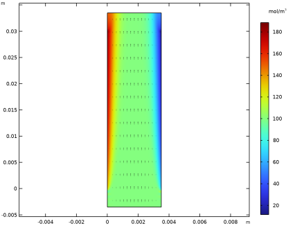 شکل 5 پتانسیل الکترولیت را نشان می دهد. در خارج از شکاف الکترود، شیب پتانسیل کم است، به این معنی که شار مهاجرت نزدیک به ورودی و خروجی کم است.