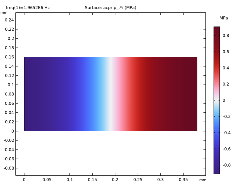 این سیستم در فرکانس رزونانس f 0 = 1.9652 مگاهرتز برای تشدید نیمه موج افقی فعال می شود. این منجر به میدان صوتی در شکل 2 و چگالی انرژی صوتی می شود که برای این نوع دستگاه های میکروسیال معمولی است. میرایی اصلی در سیستم به دلیل تلفات در لایه های مرزی چسبناک است که بنابراین ضریب Q سیستم و عرض پیک رزونانس را تعیین می کند. در یک تراشه میکروسیال واقعی همچنین میرایی قابل توجهی در مبدل پیزوالکتریک مورد استفاده برای فعال کردن سیستم و در لایه چسب وجود خواهد داشت. این می تواند اوج رزونانس را افزایش دهد و فرکانس رزونانس را کاهش دهد.