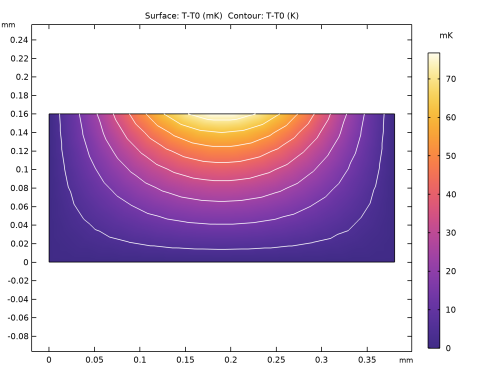 گرمایش از میدان صوتی باعث ایجاد گرادیان دما در سراسر میکروکانال می شود. افزایش دما در اثر میدان صوتی در شکل 4 نشان داده شده است . شرایط مرزی در میدان صوتی، امپدانس لایه مرزی ترموویسکوز ، گرمای تولید شده در لایه مرزی چسبناک در متغیر acpr.tvb1.Q_tot را محاسبه می کند . این منبع حرارتی مرزی برای مدلسازی افزایش دما در کانال میکروسیال استفاده میشود. در این مثال، میدان صوتی منجر به افزایش دمای کمی از مرتبه mK می شود. افزایش دما در یک دستگاه میکروسیال واقعی به میدان صوتی و همچنین به خواص حرارتی جامد اطراف بستگی دارد.